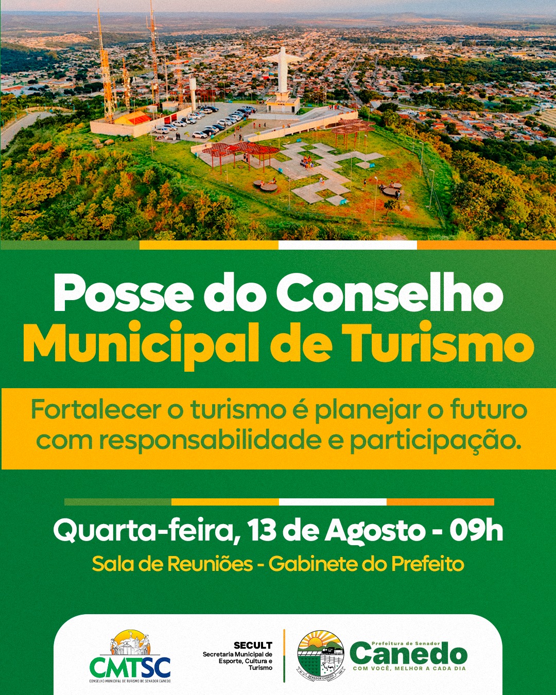 A Prefeitura de Senador Canedo, por meio da Secretaria Municipal de Esporte, Cultura e Turismo (SECULT), realizará na próxima quarta-feira, 13 de agosto, às 9h, no Gabinete do Prefeito, a posse dos novos membros do Conselho Municipal de Turismo.