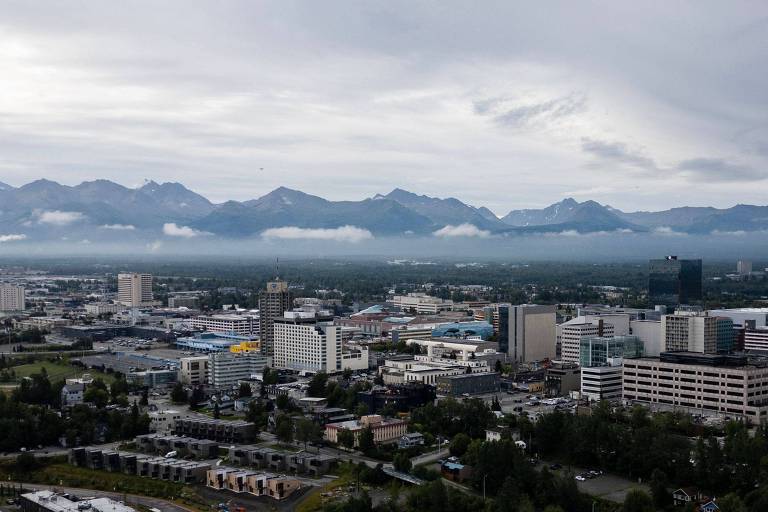 Vista aérea do centro de Anchorage, no Alasca, com as Montanhas Chugach ao fundo – Drew Angerer – 14.ago.2025/AFP