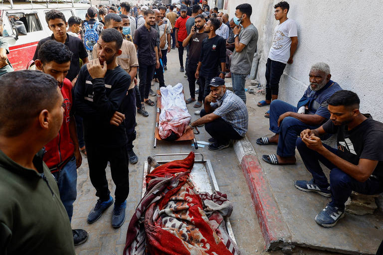 Palestinos se reúnem ao lado de civis mortos em ataque israelense enquanto buscavam ajuda, segundo médicos, no hospital Al-Shifa, na Cidade de Gaza – Mahmoud Issa – 16.ago.25/Reuters