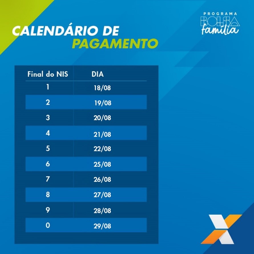 Os pagamentos são realizados de acordo com o final do NIS do beneficiário e seguem o calendário de pagamento do Programa Bolsa Família.