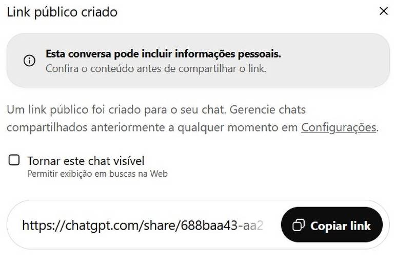 A exposição dos dados era voluntária. Para que a conversa aparecesse no Google, o usuário precisava, depois de gerar o link, selecionar a opção “tornar este chat visível”. O subtexto informava que o endereço web ficaria visível em buscas.