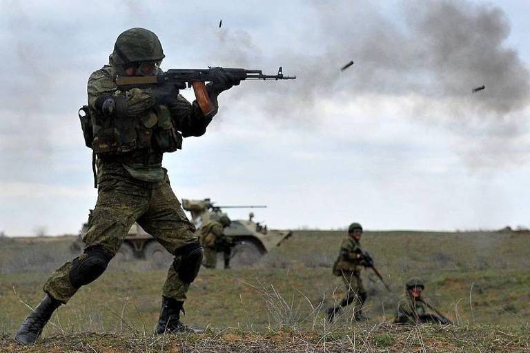 Tropas militares russas participam de um exercício no polígono de Sernovodsky, perto da fronteira da Chechênia, a cerca de 260 km ao sul da cidade russa de Stavropol. – AFP