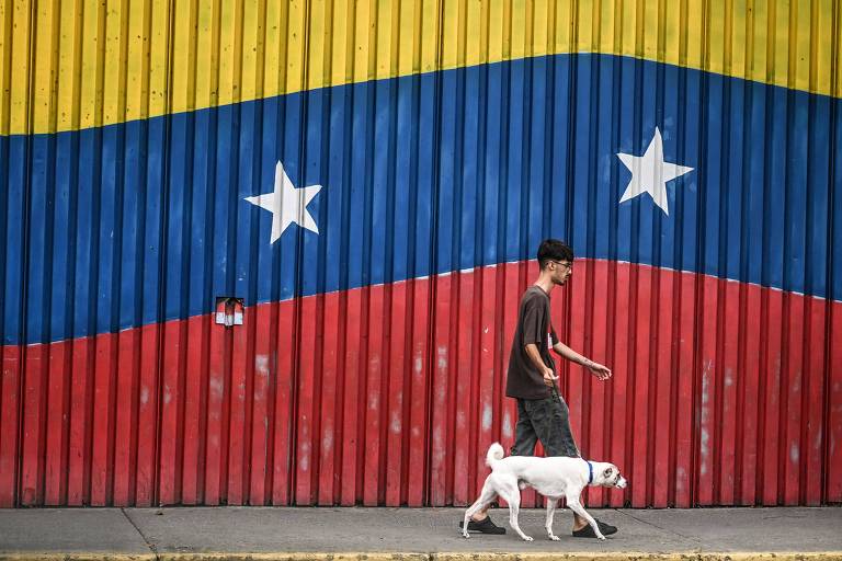 Pedestre caminha em frente a mural que exibe as cores nacionais da Venezuela, em Caracas – Juan Barreto-28.ago.25/AFP