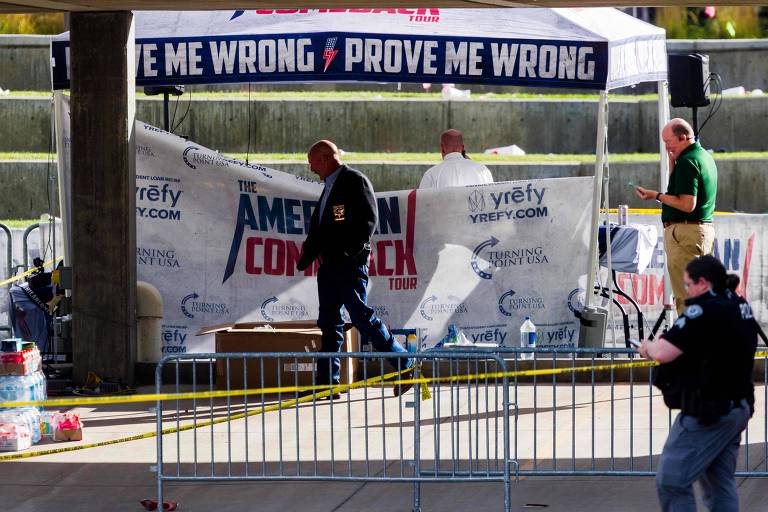 Autoridades analisam entorno da plataforma em que estava Charlie Kirk quando foi baleado e morto em universidade em Utah – Michael Ciaglo – 12.set.25/Getty Images via AFP