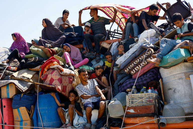 Palestinos deslocados pelo conflito deixam a Cidade de Gaza em direção ao sul do território – Mahmoud Issa/Reuters
