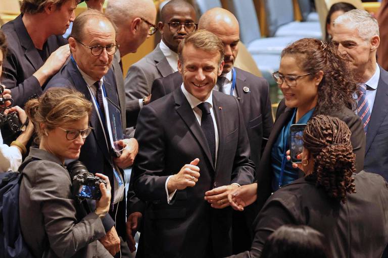 O presidente da França, Emmanuel Macron (centro), durante chegada a evento sobre a solução de dois Estados na sede da ONU, em Nova York – Ludovic Marin/AFP