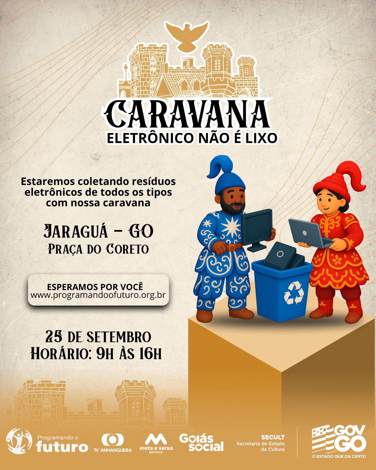 Fonte: https://jaragua.go.gov.br/jaragua-recebe-caravana-da-sustentabilidade-e-tecnologia-doe-seu-lixo-eletronico-e-ajude-escolas/