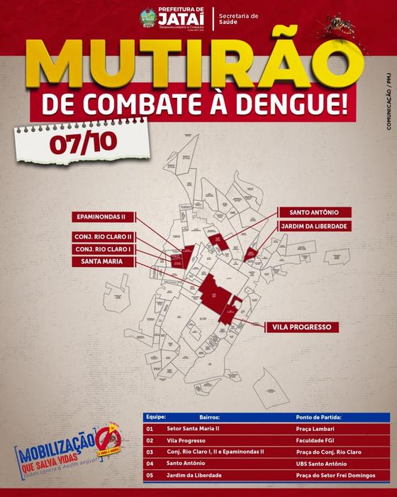 A Prefeitura de Jataí, através da Secretaria Municipal de Saúde, informa o cronograma de ação de combate ao mosquito Aedes aegypti para esta terça-feira, dia 7 de outubro de 2025.