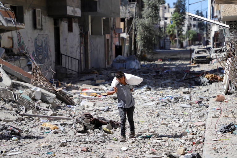 Menino palestino carrega sacola com farinha no bairro de Sabra após operação israelense, na Cidade de Gaza – Ebrahim Hajjaj/Reuters