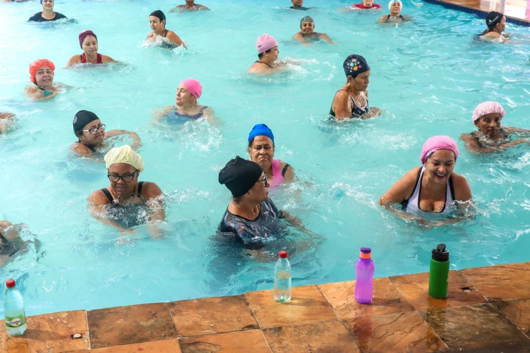 A hidroginástica é uma modalidade que combina exercícios físicos e diversão, utilizando a água como aliada. Por ser uma atividade de baixo impacto, ela reduz o risco de lesões e é ideal para pessoas da terceira idade, ajudando na melhora da mobilidade, do equilíbrio, da resistência muscular e da circulação sanguínea. Além dos benefícios físicos, as aulas também contribuem para a socialização e o combate à solidão, fatores essenciais para a saúde mental. Para dona Marlene Tolentino, a hidroginástica trouxe melhora e mobilidade, já que ela enfrentava um sério problema na musculatura do joelho. “Eu cheguei aqui com muitas dores no joelho, mal conseguia andar e hoje eu subo até escada e consigo cuidar da minha casa”, conta a idosa.