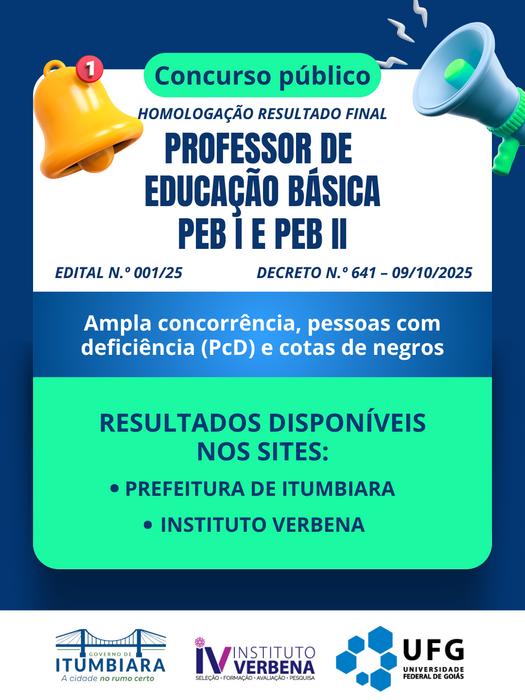 A Prefeitura de Itumbiara torna pública a homologação do resultado final do Concurso Público, conforme Decreto nº 641, de 09/10/2025.