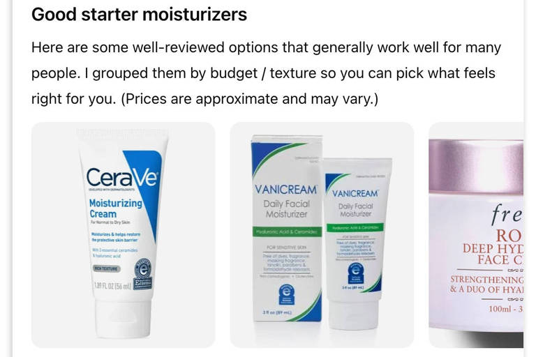 Abaixo das imagens, havia sugestões adicionais divididas por categorias, como “bons hidratantes para iniciantes” e “recomendações de especialistas”, com links para conteúdos que mencionavam os produtos. O ChatGPT também incluiu descrições e benefícios de cada item.