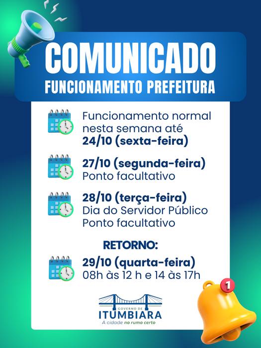 A Prefeitura de Itumbiara decretou ponto facultativo, nas repartições públicas municipais, na segunda e na terça-feira, dias 27 e 28 de outubro. Em função do Dia do Servidor Público, comemorado em 28 de outubro.