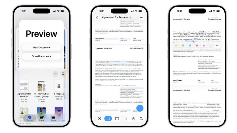 O iOS 26, disponível a partir do iPhone 11, trouxe consigo o aplicativo Pré-Visualização, que reúne na mesma página o leitor de documentos PDF e o digitalizador —função antes escondida no app Notas. Nele também é possível adicionar uma assinatura digital.