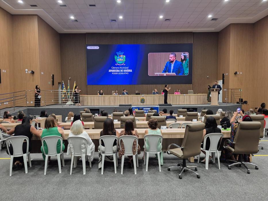 Câmara Municipal de Aparecida de Goiânia, 29/10/2025. Na noite desta quarta-feira, 29, a Câmara Aparecida realizou uma homenagem especial aos profissionais de apoio escolar, por meio de propositura do vereador Rogério Almeida. Durante a solenidade, foram entregues mais de 60 certificados em reconhecimento ao trabalho desses servidores, que desempenham uma função essencial para garantir a inclusão, a permanência e o aprendizado efetivo de todos os alunos no ambiente educacional.