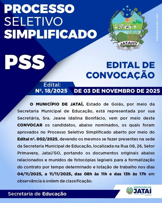 O MUNICÍPIO DE JATAÍ, Estado de Goiás, por meio da Secretaria Municipal de Educação, está representada por sua Secretária, Sra. Jeane Idalina Bonifácio, vem por meio deste CONVOCAR os candidatos, abaixo nominados, os quais foram aprovados no Processo SeletivoSimplificado aberto por meio do EDITAL Nº. 002/2025, devendo os mesmos se fazer presentes na sede da Secretaria Municipal de Educação, localizada na Rua 08, 26, Setor Primavera, Jataí/GO, portando os documentos originais abaixo relacionados e munidos de fotocópias legíveis para a formalização do contrato por tempo determinado e lotação de trabalho nos dias 04/11/2025, a 11/11/2025, das 08h às 11h e das 13h às 17h em observância à ordem de classificação .