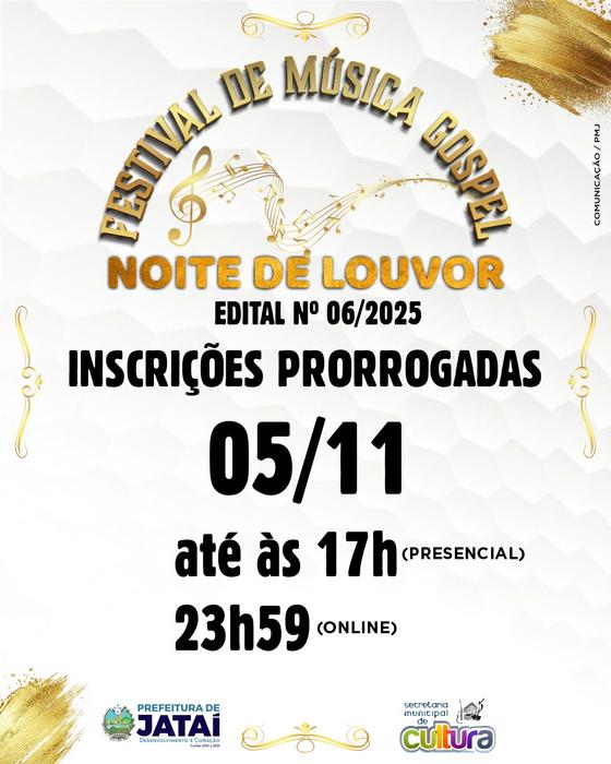 A Prefeitura Municipal de Jataí, por meio da Secretaria Municipal de Cultura em parceria com a Escola Municipal de Música Nestor Garcia, publicou a Errata 01ao Edital nº 06/2025, prorrogando o prazo de inscrições para o “Festival de Música Gospel – Noite de Louvor” até o dia 5 de novembro de 2025.