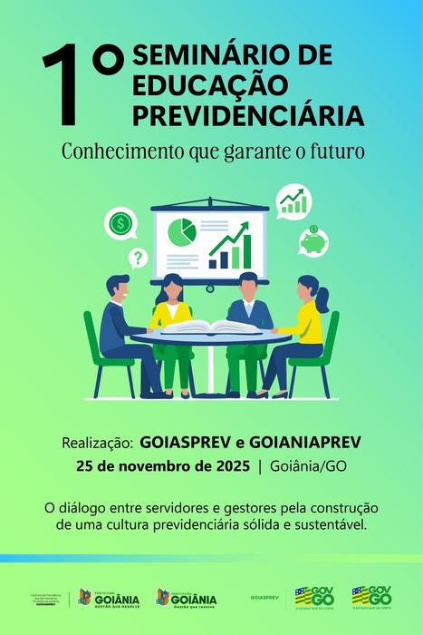A Prefeitura de Goiânia, por meio do Instituto de Previdência dos Servidores do Município de Goiânia (GoiâniaPrev) e em parceria com o Goiás Previdência (GoiásPrev), recebe até a próxima quarta-feira (12/11), inscrições para o 1º Seminário de Educação Previdenciária, que será realizado no dia 25/11, no auditório do Tribunal de Justiça do Estado de Goiás. As inscrições podem ser feitas de forma simples e gratuita em https://bit.ly/49DDuY9.
