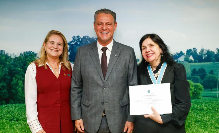 O ministro da Agricultura e Pecuária, Carlos Fávaro, entregou, nesta quarta-feira (5), a Medalha de Mérito Apolônio Salles à pesquisadora da Embrapa Soja, Mariangela Hungria, em cerimônia realizada no auditório Olacyr de Moraes, no Ministério da Agricultura e Pecuária (Mapa), em Brasília. A honraria marca o reconhecimento do Estado brasileiro à relevância científica e ao impacto social de sua trajetória, que transformou o uso de insumos biológicos na agricultura e consolidou o Brasil como referência mundial em tecnologias sustentáveis de produção de alimentos.