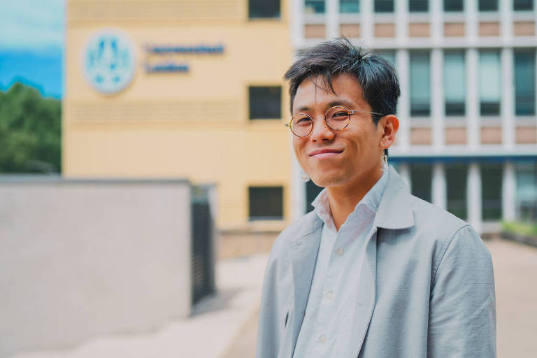 O antropólogo e cientista da computação Rodrigo Ochigame em frente à fachada da Universidade de Leiden, na Holanda – Suédy Mauricio/Divulgação/Universidade de Leiden