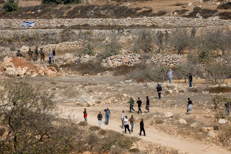 Palestinos e militares de Israel perto de Hebron, na Cisjordânia ocupada – Mussa Qawasma – 13.nov.25/Reuters