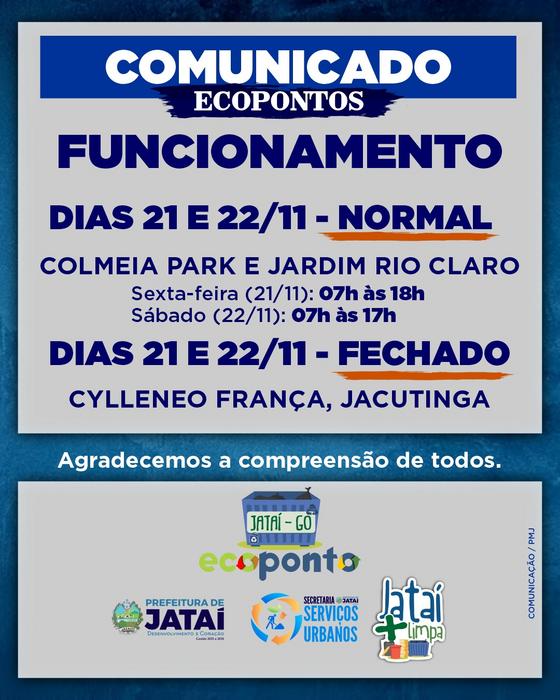 A Prefeitura de Jataí, por meio da Secretaria Municipal de Serviços Urbanos, comunica o funcionamento especial dos Ecopontos nos dias 21 e 22 de novembro (sexta e sábado). Esta alteração no horário e nas unidades ocorre em função do ponto facultativo da sexta-feira (dia 21), que sucede o feriado do Dia da Consciência Negra (quinta-feira, dia 20).