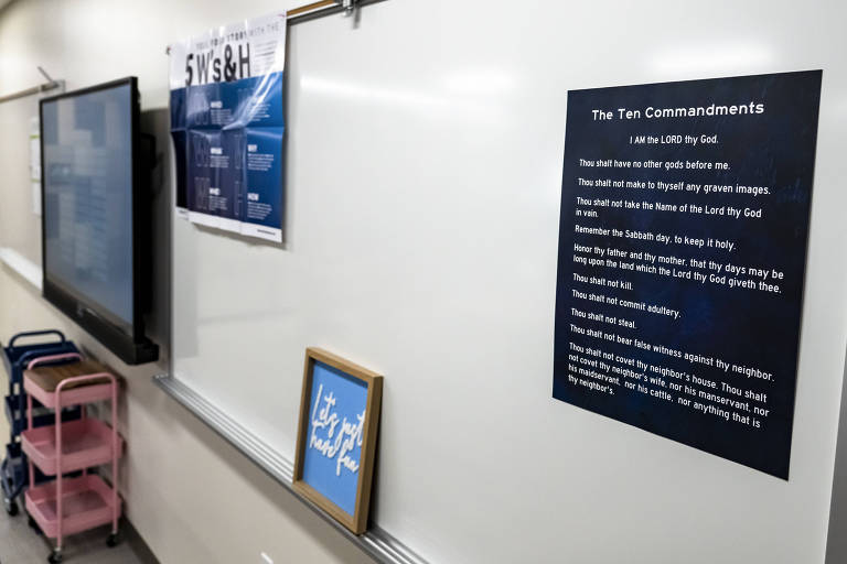 Cartaz mostra os Dez Mandamentos em sala de aula em Willis, no Texas – Meridith Kohut – 13.ago.25/NYT