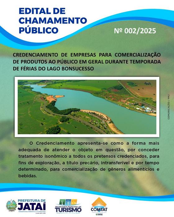A Prefeitura de Jataí, por meio da Secretaria Municipal de Turismo e COMTAT, torna público o Credenciamento n° 002/2025 para autorizar a comercialização de alimentos e bebidas na Praça de Alimentação do Lago Bonsucesso durante a temporada de férias.