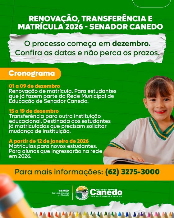 A Prefeitura de Senador Canedo, por meio da Secretaria de Educação, anuncia o cronograma oficial de renovação, transferência e para 2026 e reforça que os pais fiquem atentos aos prazos.