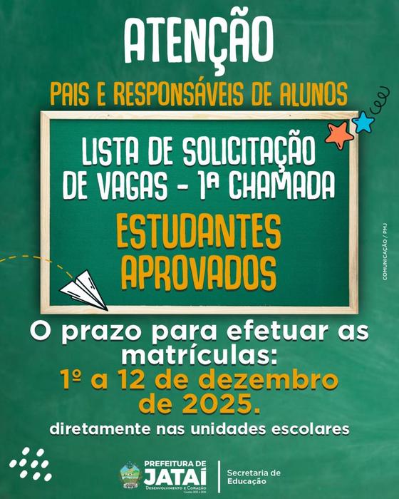 A Prefeitura de Jataí, por meio da Secretaria Municipal de Educação (SME), informa a publicação da Lista de Solicitação de Vagas – 1ª Chamada, contendo os estudantes aprovados para ingresso nas Unidades Escolares da Rede Municipal de Ensino, bem como a unidade escolar em que deverá ser realizada a matrícula.