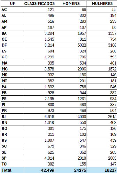 O Distrito Federal permanece como o estado com o maior número de pessoas classificadas (8.214), resultado diretamente relacionado à concentração de órgãos públicos federais e ao volume expressivo de vagas ofertadas para a região. Na sequência, destacam-se Rio de Janeiro (6.616), São Paulo (4.014), Minas Gerais (3.578) e Bahia (3.294), que juntos concentram mais de 60% do total nacional.