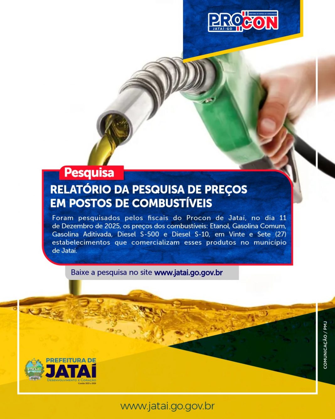 O Procon ressalta que os preços coletados refletem a realidade apenas no momento da pesquisa, podendo haver alterações posteriores. A pesquisa completa, com a lista detalhada de preços por estabelecimento, está disponível para consulta. Você pode ter acesso a pesquisa completa clicando neste link: https://www.jatai.go.gov.br/download/pesquisa-combustiveis-dezembro-2025-pdf/.