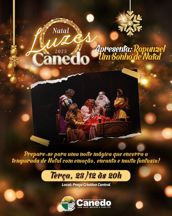A Prefeitura de Senador Canedo encerra nesta terça-feira (23), às 20h, na Praça Criativa Central, a programação do Natal Luzes 2025 – A cidade que aprendeu a brilhar, com a apresentação do espetáculo “Rapunzel – Um Sonho de Natal”.
