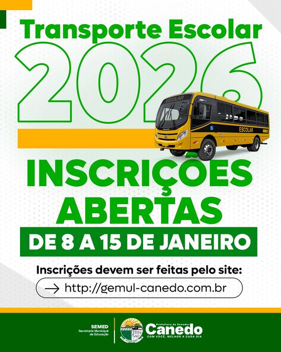 A Prefeitura de Senador Canedo, por meio da Secretaria Municipal de Educação, abre nesta quinta-feira, 8, o cadastro para o Transporte Escolar do ano letivo de 2026. As inscrições seguem até o próximo dia 15 e são destinadas a alunos das redes municipal e estadual de ensino.