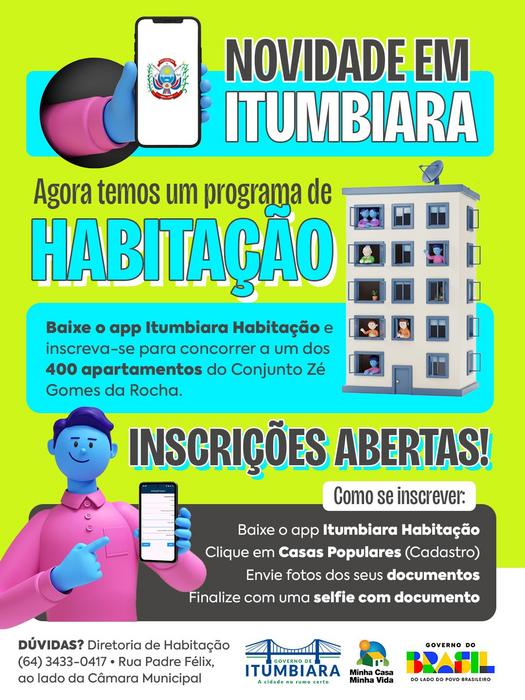 📲 Basta baixar o aplicativo Itumbiara Habitação, fazer seu cadastro e acompanhar todo o processo de forma simples e segura. Inscrição totalmente virtual.