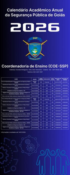A Secretaria de Estado da Segurança Pública (SSP-GO), através da Coordenadoria de Ensino (COE–SSP), divulga o – Exercício 2026. A divulgação tem por finalidade assegurar ampla publicidade às ações educacionais planejadas para o exercício, fortalecer a transparência institucional e permitir o adequado planejamento por parte das instituições e servidores interessados.