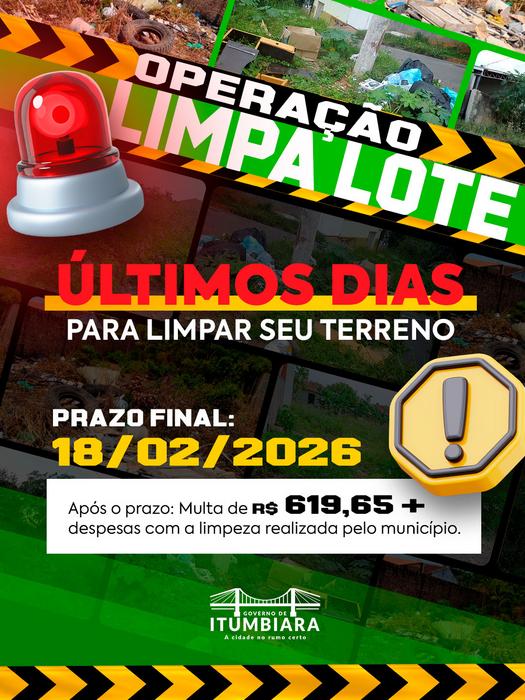 A Prefeitura de Itumbiara reforça que está chegando ao fim o prazo da Operação Limpa Lote, uma ação importante para manter a cidade limpa, organizada e segura.
