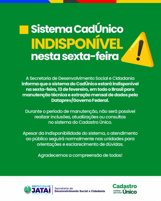 Fonte: https://www.jatai.go.gov.br/sistema-do-cadastro-unico-estara-indisponivel-nesta-sexta-feira-13-02/