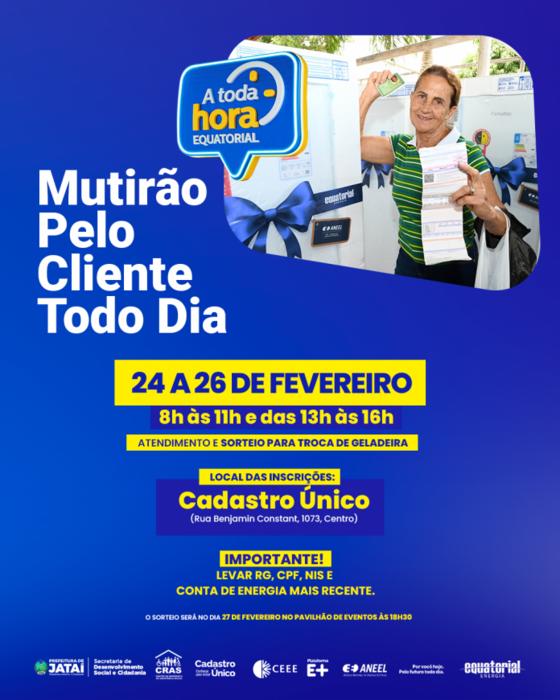 A Prefeitura de Jataí, por meio da Secretaria de Desenvolvimento Social e Cidadania, em parceria com a Equatorial Energia,realizará de 24 a 26 de fevereiro o Mutirão Pelo Cliente Todo Dia, uma grande ação voltada ao atendimento da população com oferta de serviços essenciais, benefícios sociais e oportunidades de capacitação profissional.