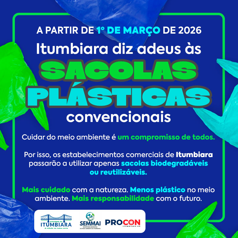 A partir de 1º de março, as sacolas plásticas convencionais deixam de ser utilizadas no comércio da cidade. Agora, serão adotadas apenas sacolas biodegradáveis ou reutilizáveis.