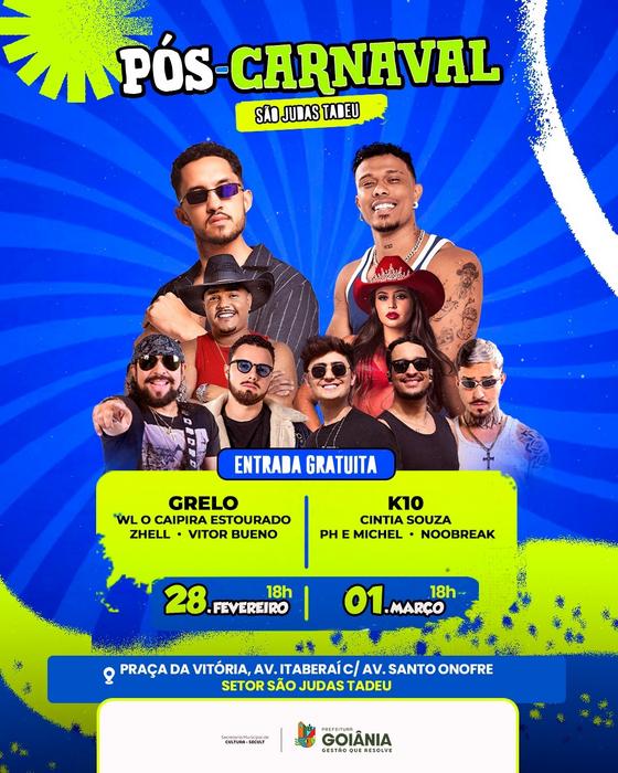 A Prefeitura de Goiânia, por meio da Secretaria Municipal de Cultura (Secult), realiza mais uma edição do pós-Carnaval, com dois dias de programação gratuita nas regiões Leste e Oeste da capital. Os eventos serão realizados gratuitamente nos dias 28/1 (sábado) e 1º/3 (domingo), a partir das 18h, com música e entretenimento nas praças dos setores São Judas Tadeu e Jardim Novo Mundo, respectivamente.