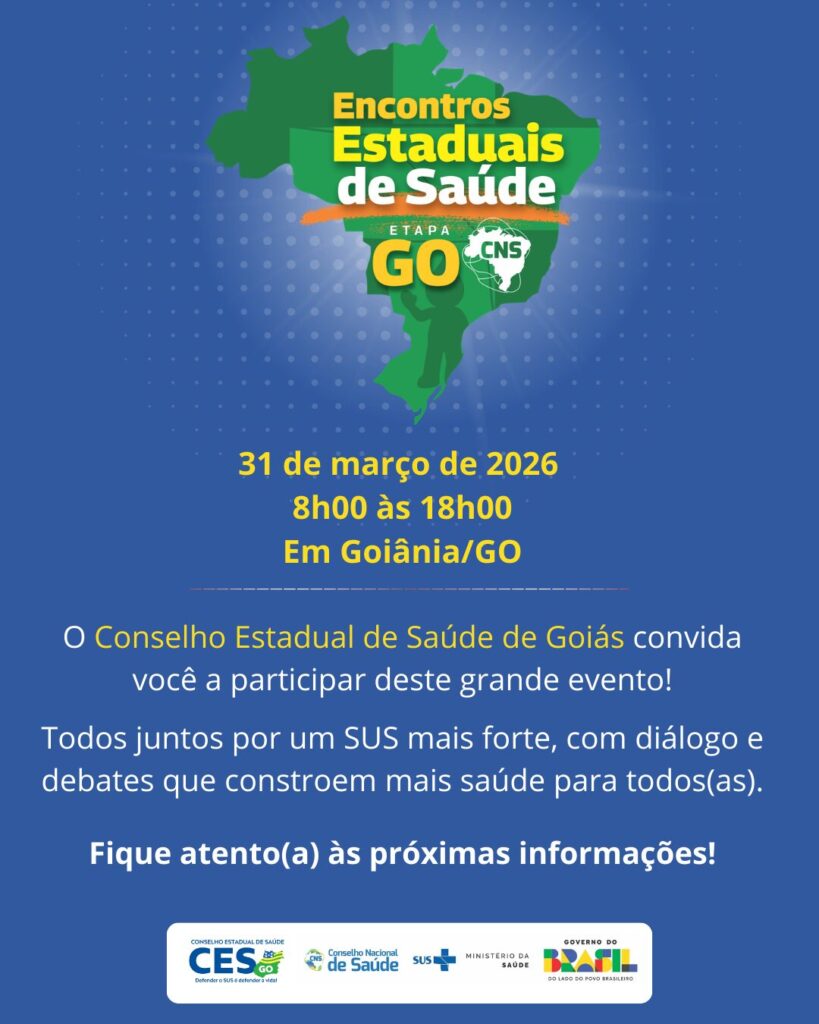 O Conselho Estadual de Saúde de Goiás convida representantes da sociedade civil, conselhos de saúde, lideranças e movimentos sociais para participar doEncontro Estadual de Saúde – Etapa Goiás, que será realizado no dia31 de março de 2026, das8h às 18h, emGoiânia. O local do evento será divulgado em breve.
