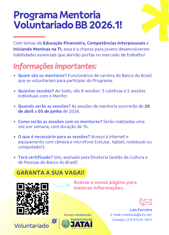 A Prefeitura de Jataí está apoiando a divulgação do Programa Mentoria Voluntariado BB, que oferece orientação e desenvolvimento de habilidades para estudantes de escolas públicas.