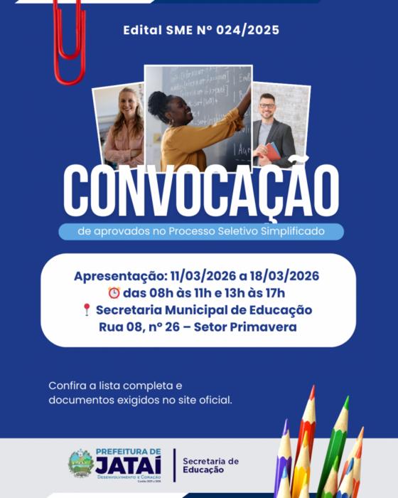A Secretaria Municipal de Educação de Jataí publicou o Edital de Convocação SME nº 024/2025, convocando candidatos aprovados no Processo Seletivo Simplificado para formalização de contrato por tempo determinado.