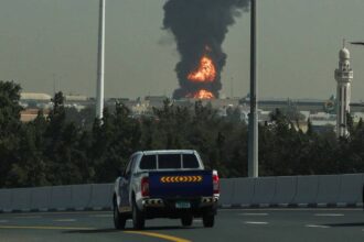 Incêndio após ataque de drone iraniano no aeroporto de Dubai; ao fundo, o maior prédio do mundo, o Burj Khalifa – AFP