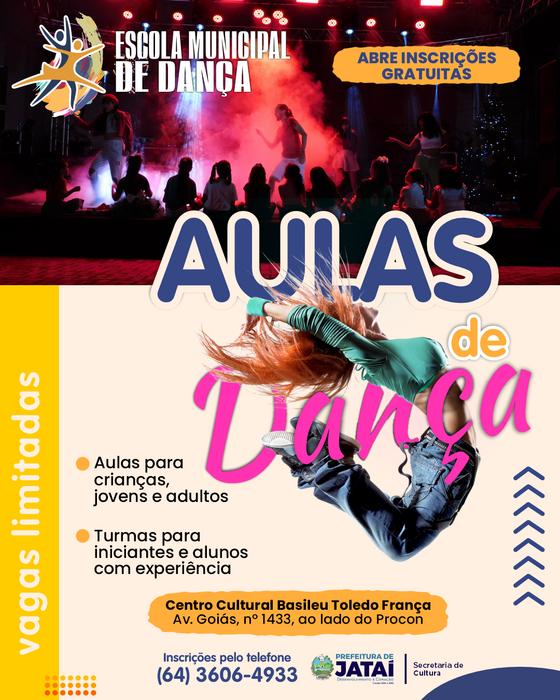 A Secretaria Municipal de Cultura de Jataí abriu inscrições para as atividades da Escola Municipal de Dança de Jataí, que retomou suas aulas em março de 2026. As aulas são gratuitas e abertas à comunidade, sendo realizadas no Centro Cultural Municipal Basileu Toledo França (CCBF).