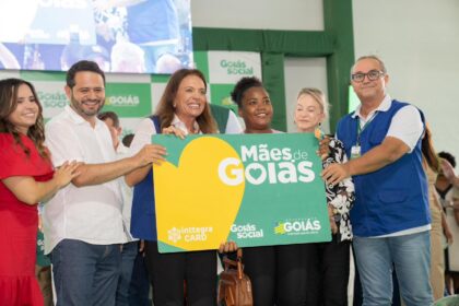 Prefeito Marden Júnior e secretária Rouane Azevedo recebem veículo durante solenidade em Goiânia. Eles destacam programa Goiás Social idealizado pela primeira-dama do Estado, Gracinha Caiado, e agrade...