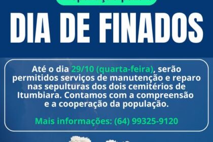 🕊️ O Dia de Finados se aproxima, e a Prefeitura de Itumbiara informa que os serviços de manutenção e reparos nas sepulturas dos dois cemitérios da cidade serão permitidos até o dia 29/10 (quarta-feira...