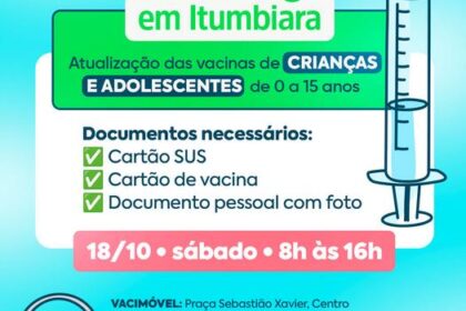 15 de outubro de 2025 💉 Dia D de Vacinação em Itumbiara! 🩵 Neste sábado, 18 de outubro, das 8h às 16h, é dia de atualizar a caderneta de vacinação de crianças e adolescentes de 0 a 15 anos. 👧🧒 📍 Leve ...