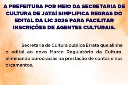 Secretaria de Cultura publica Errata que alinha o edital ao novo Marco Regulatório da Cultura, eliminando burocracias e nos orçamentos. A Prefeitura de Jataí, por meio da Secretaria Municipal de Cultu...